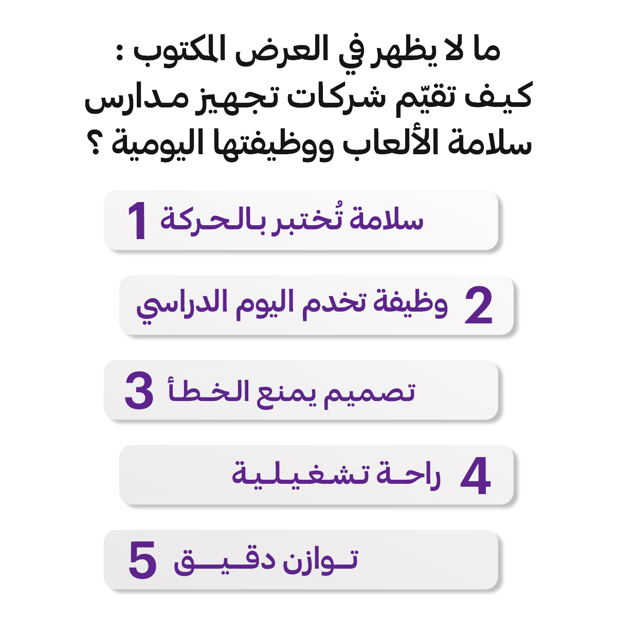 العرض التجاري غالبًا يركّز على ماذا سنسلّم، لكنه لا يشرح كيف سيعمل هذا داخل المدرسة. هنا يبدأ الفرق بين شركة تبيع منتجًا، وشركة تجهيز تفهم أن الألعاب التعليمية جزء من منظومة تشغيلية وتربوية تؤثر في سلوك الطفل، وتنظيم الفصل، وراحة المعلم، وصورة المؤسسة أمام أولياء الأمور.